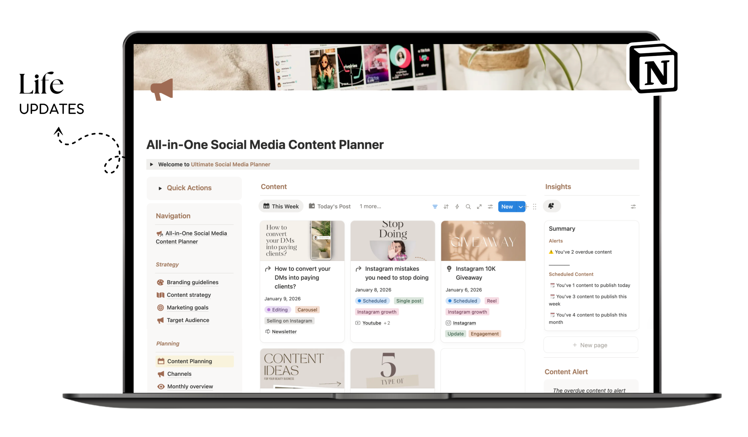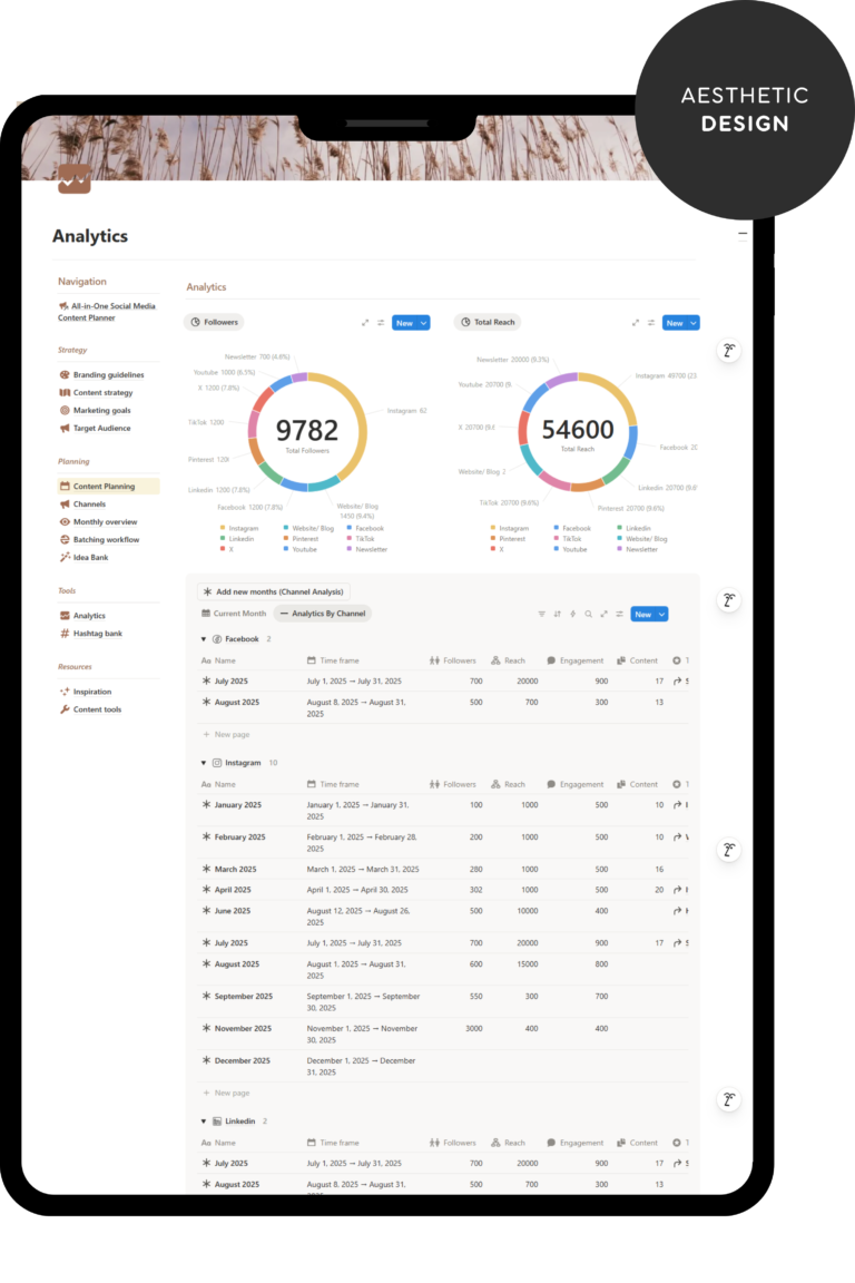 The All-in-One Social Media Content Planner is a powerful Notion system designed to help content creators stay organized, consistent, and strategic. From brand guidelines to content scheduling and analytics.