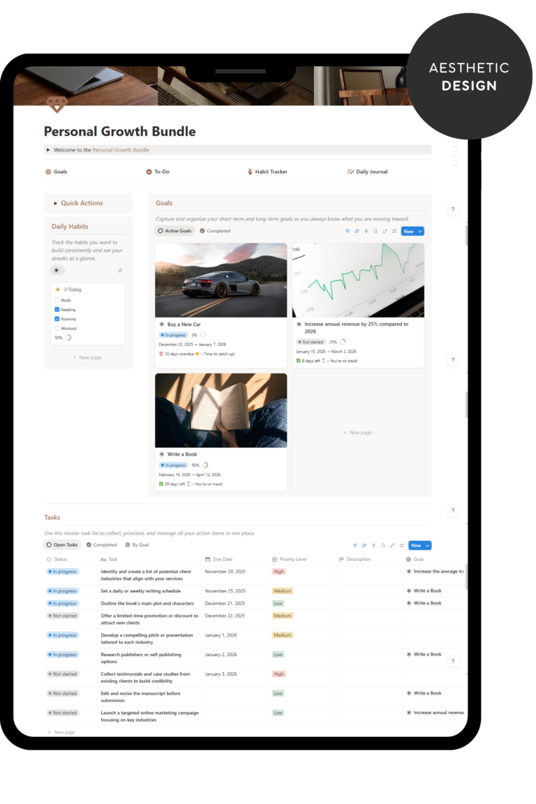 A high-performance 4-in-1 Notion system designed by a 7-figure operator to help you organize your life and scale your vision.
