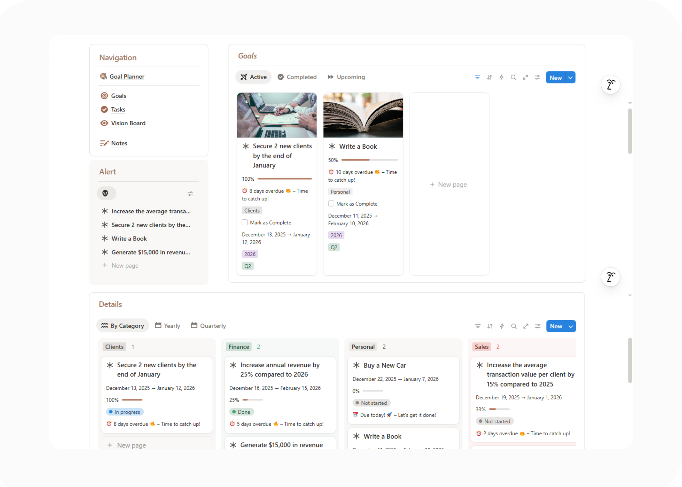 An all-in-one Notion goal planner that helps you define your goals, stay aligned with your priorities, and track progress effortlessly—so you can turn intentions into achievements.